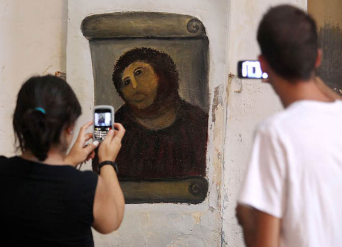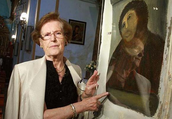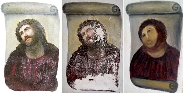 스페인의 사라고사주 캄포 데 보르하 지방의 미제리코르디아 성당에는 100년이 넘은 예수 벽화 ‘에케 호모’가 있었습니다. 이 벽화는 시간이 흐르면서 손상이 되어 복원이 필요하게 되었습니다. 성당 측은 독실한 신도이자 아마추어 화가인 세실리아 히메네스(당시 80대)에게 복원을 맡겼습니다. 세실리아는 평소에도 성당의 미사와 그림 그리기를 즐겼던 사람으로, 성당 측의 요청에 기꺼이 응하였습니다.