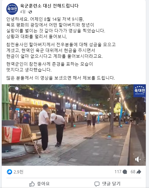 지난 8월 14일, 전남 목포의 평화의 광장에서 현역 육군 대위가 참전용사에게 존경을 표하는 모습이 한 시민의 제보로 인해 알려지게 되었습니다. 이 대위는 참전용사가 전우들을 후원하기 위해 모금 활동을 하고 있는 모습을 발견하고, 자신이 가지고 있던 현금을 모두 내어놓았습니다. 이 장면은 단순히 군인이 예의를 갖춘 행위로 끝나는 것이 아니라, 한 개인이 나라를 위해 헌신한 이들에게 진정한 감사의 마음을 전한 사례로 기억될 것입니다.
