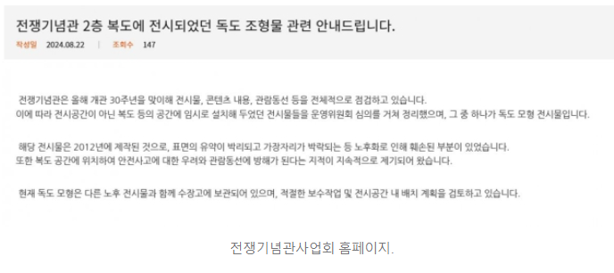 독도는 대한민국의 영토이며, 그 상징성은 말로 다 표현할 수 없을 정도로 중요합니다. 이러한 상징성을 담아 전쟁기념관 2층 복도에 2012년부터 전시되었던 독도 모형은 오랫동안 많은 방문객들에게 독도의 의미를 전달해왔습니다. 그러나 전쟁기념관사업회는 이번 개관 30주년을 맞아 전시물 전체를 점검하는 과정에서 독도 모형을 비롯한 여러 전시물의 상태를 재평가했고, 그 결과 독도 모형이 철거되기에 이르렀습니다.