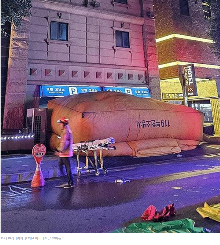 이번 사건에서 가장 논란이 되고 있는 부분은 에어매트의 설치와 작동 방식입니다. 에어매트는 건물에서 뛰어내리는 사람들의 충격을 흡수하여 생명을 구하는 장비로, 이번 화재 현장에서 소방대원들은 호텔 주차장 출입구에 에어매트를 설치했습니다. 7층에서 뛰어내린 두 사람 중 한 명은 에어매트의 가장자리에 떨어졌고, 이어서 뛰어내린 다른 한 명은 매트가 뒤집히면서 생긴 빈 공간에 떨어져 숨졌습니다.