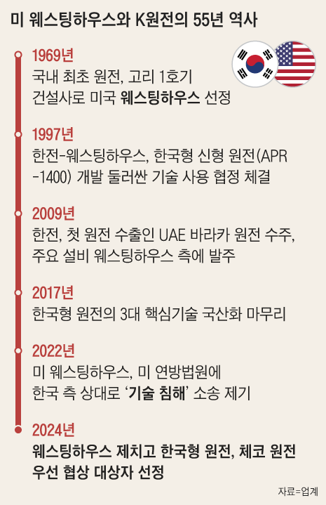2022년 10월, 웨스팅하우스는 미국 법원에 한국수력원자력이 자사의 기술을 침해했다고 주장하며 소송을 제기했습니다. 웨스팅하우스는 "한수원이 원전을 수출하려면 미국 정부의 허가를 받아야 한다"고 주장하였고, 이에 따라 미국 법원은 이 문제를 다루기 시작했습니다. 비록 2023년 미 워싱턴 DC 연방지방법원은 이 소송을 각하했지만, 웨스팅하우스는 항소를 제기하였고, 현재 항소법원에서 소송이 진행 중입니다.