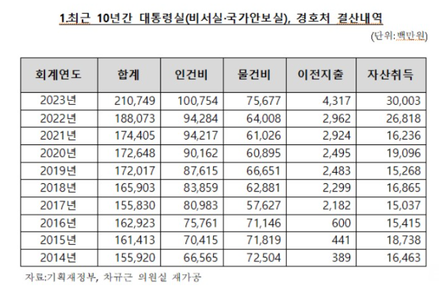 대통령실과 대통령경호처에서 지난해 집행한 인건비가 1000억 원을 넘겨 최근 10년 사이 최대치를 기록했습니다. 국회 예산결산특별위원회 소속 차규근 조국혁신당 의원이 기획재정부로부터 제출받은 자료에 따르면, 2023년 대통령실과 경호처의 인건비 실집행액은 무려 1007억5400만 원에 달했습니다. 이는 2014년에 기록된 665억6500만 원에 비해 약 51% 증가한 수치이며, 윤석열 대통령 취임 첫해였던 2022년과 비교해도 약 6.8% 증가한 금액입니다.