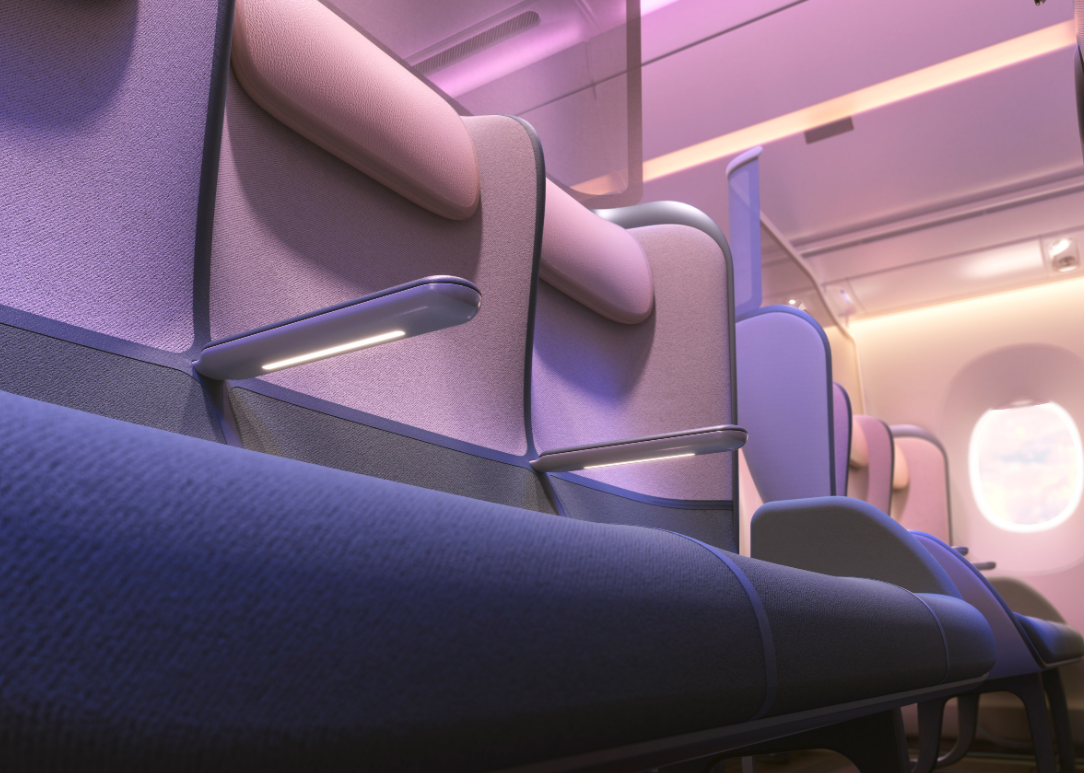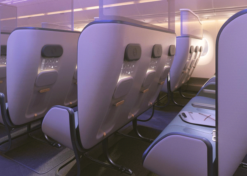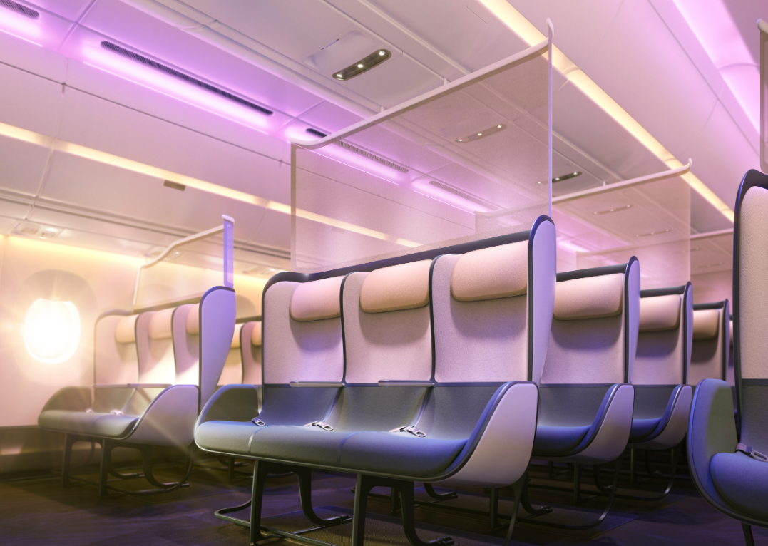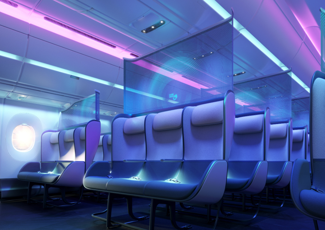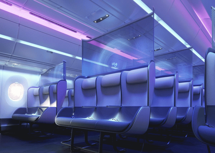 코로나 바이러스 전염병 이후 항공기 객실 내부에 대한 PriestmanGoode 의 컨셉 은 먼지가없는 표면과 승객의 불안을 완화하기위한 "색상 심리학"을 특징으로합니다.
