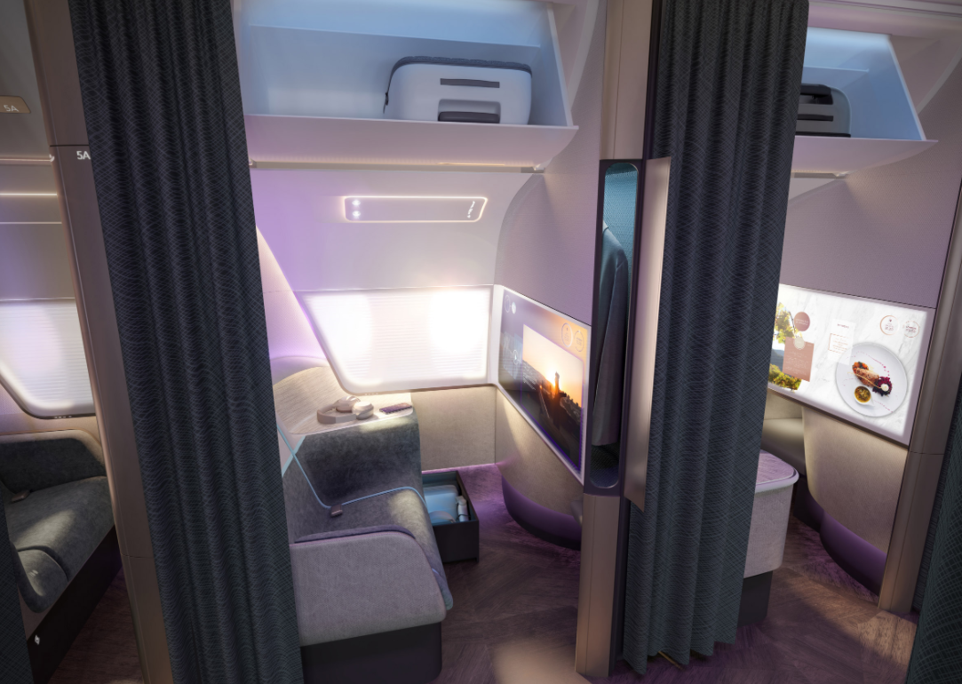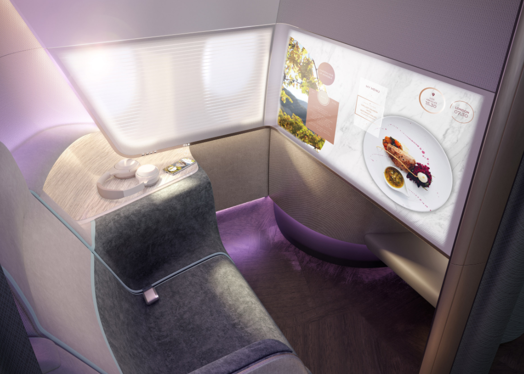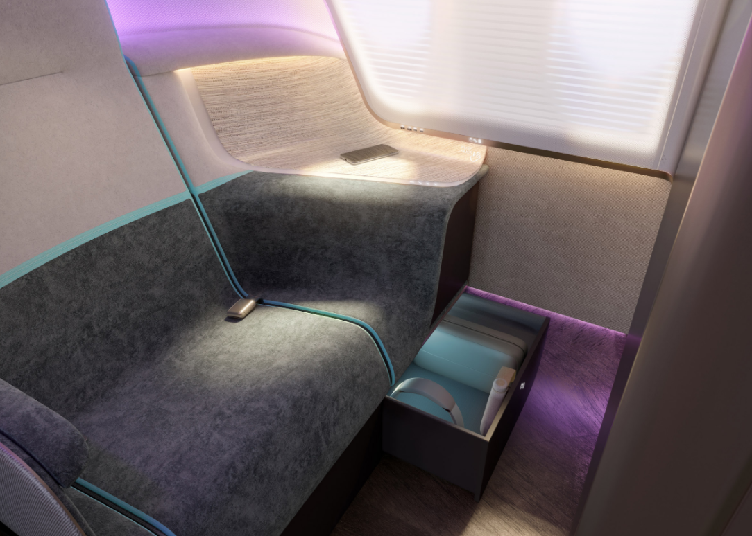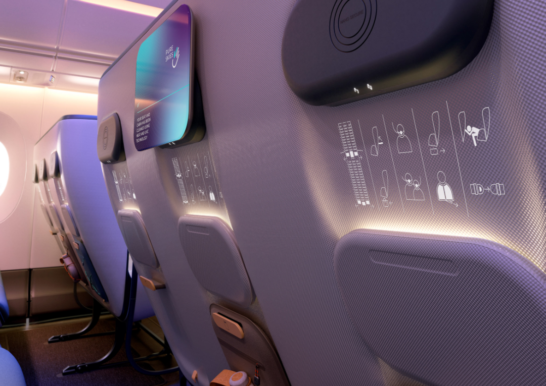 각 방에는 제스처로 제어되는 IFE 시스템이있어 승객의 장치와 동기화되어 터치가 필요 없습니다. 재 설계된 좌석은 최소한의 분할 선과 용접 된 직물 이음새를 갖습니다.