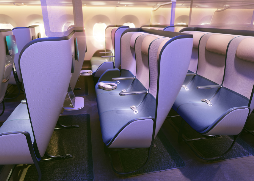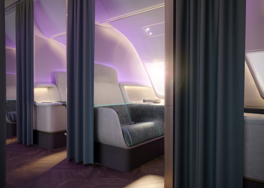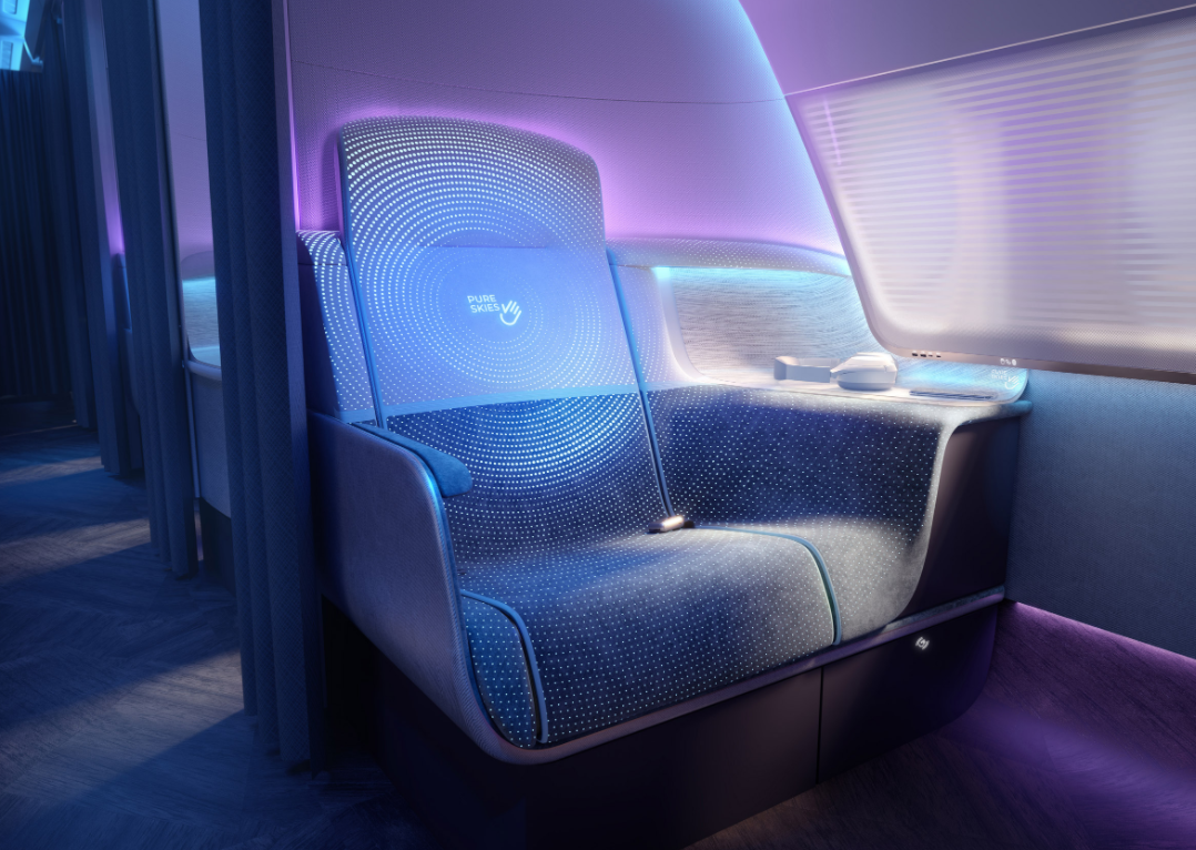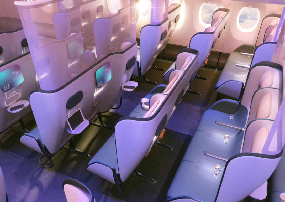 Pure Skies 개념은 전통적인 클래스 기반 좌석 시스템을 제거합니다. 비즈니스석은 "객실"이고 이코노미 석은 "구역"입니다.