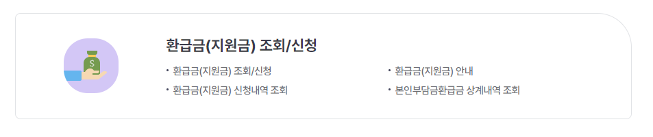 홈페이지 메인 메뉴에서 '민원신청' > '환급금 조회/신청'으로 이동합니다. 해당 메뉴에서 '본인부담상한제'를 선택합니다. - 환급금 조회