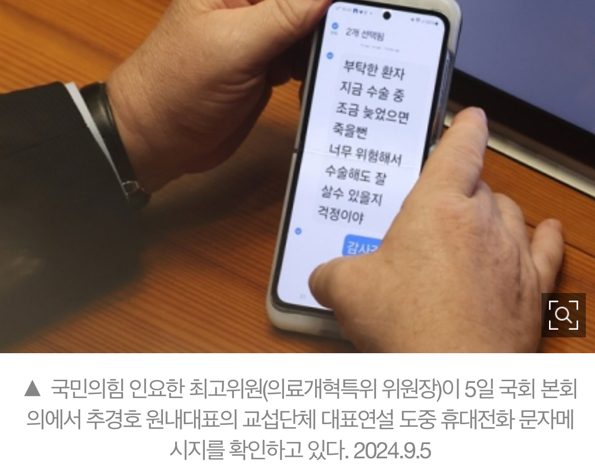 해당 메시지는 9월 5일 국회 본회의에서 추경호 원내대표의 교섭단체 대표연설 도중 포착되었습니다. 메시지의 내용은 “부탁한 환자 지금 수술 중이다. 조금 늦었으면 죽을 뻔했다. 너무 위험해서 수술해도 잘 살 수 있을지 걱정”이라는 문구와 함께, 이에 대한 인 최고위원의 "감사감사"라는 답변이 담겨 있었습니다. 이 메시지가 공개되자, 야당 측에서는 인요한 최고위원이 청탁금지법을 위반한 것이 아니냐는 강한 비판이 제기되었습니다.