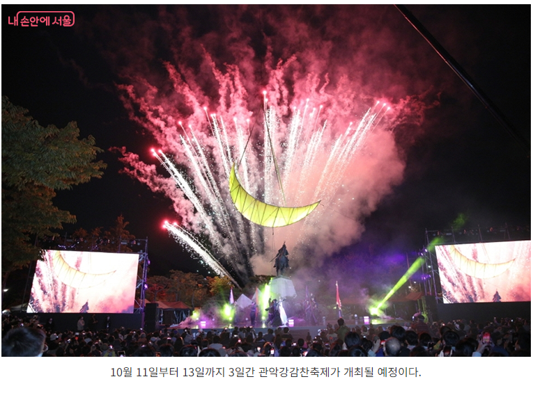 관악강감찬축제는 10월 11일부터 13일까지 낙성대공원에서 개최되며, 강감찬 장군과 관련된 전통 문화 예술 공연, 퍼레이드, 드론쇼 등 다채로운 프로그램이 준비되어 있습니다. 서울축제를 통해 역사 속 인물과 만나는 시간 여행을 떠나보세요.