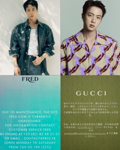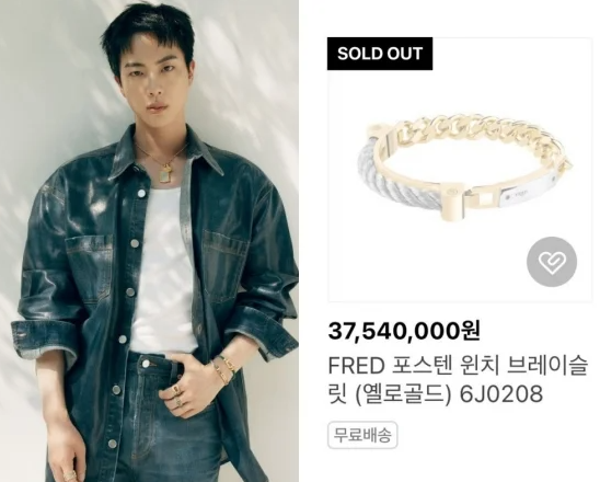 진의 구찌 글로벌 앰버서더 발탁 소식은 프랑스 하이주얼리 메종 프레드(FRED)에서도 비슷한 반응을 일으켰습니다. 프레드는 진을 첫 글로벌 앰버서더로 선정한 직후, 그가 착용한 1억 3460만 원 상당의 목걸이, 3750만 원 상당의 팔찌, 1720만 원 상당의 귀걸이 등이 순식간에 품절되었습니다. 이와 함께 프레드의 공식 웹사이트는 트래픽 과부하로 인해 일시적으로 다운되기도 했습니다.