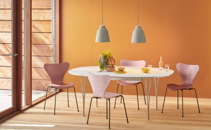 "따뜻한 톤으로 결합"된이 색상은 덴마크 건축가이자 디자이너 Jacobsen이 디자인 한 브랜드의 Series 7, Ant 및 Grand Prix 의자에 적용되었습니다 .