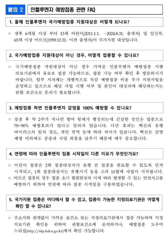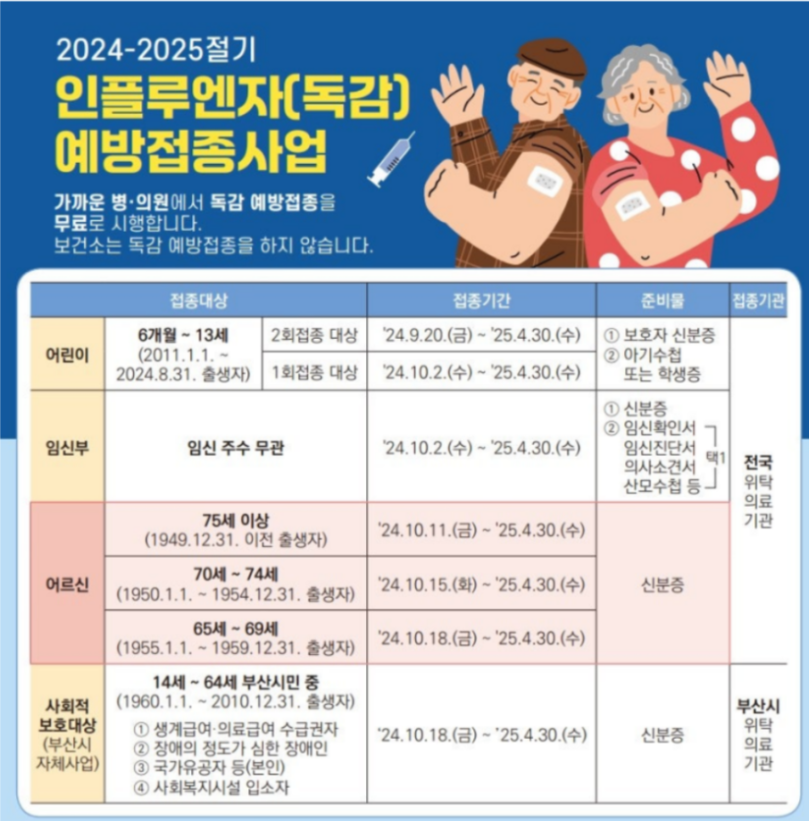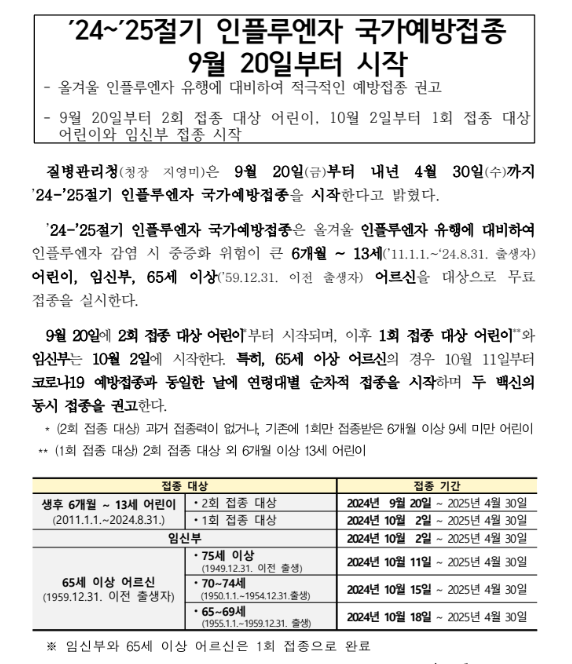 - 접종 시기: 75세 이상: 10월 11일 ~ 2025년 4월 30일, 70~74세: 10월 15일 ~ 2025년 4월 30일, 65-69세: 10월 18일 ~ 2025년 4월 30일