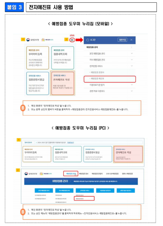 2024년 독감예방접종부터는 전자 예진표가 도입되어, 접종 전 미리 집에서 작성할 수 있는 시스템이 마련되었습니다. 예방접종 도우미 누리집에 접속하여 전자 예진표를 작성하면, 병원에서 접종 시 시간을 절약할 수 있습니다. 다만, 접종 당일 작성한 예진표만 효력이 발생하며, 독감예방접종과 코로나19 백신을 동시에 맞을 경우 각 백신의 예진표를 따로 작성해야 합니다.