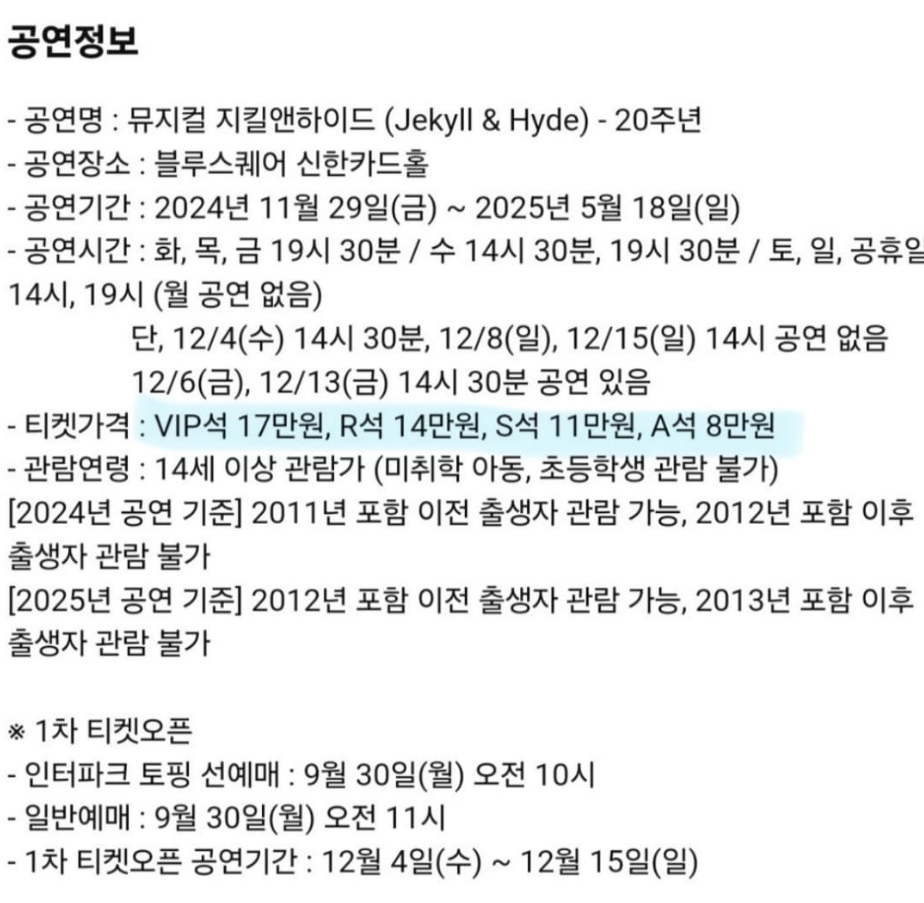 2024년 지킬앤하이드 20주년 기념 공연은 2024년 11월 29일 프리뷰 공연을 시작으로 2025년 5월 18일까지 약 6개월간 진행됩니다. 공연은 서울 용산구에 위치한 블루스퀘어 신한카드홀에서 열리며, 이번 시즌 역시 많은 관객들이 몰릴 것으로 예상됩니다.