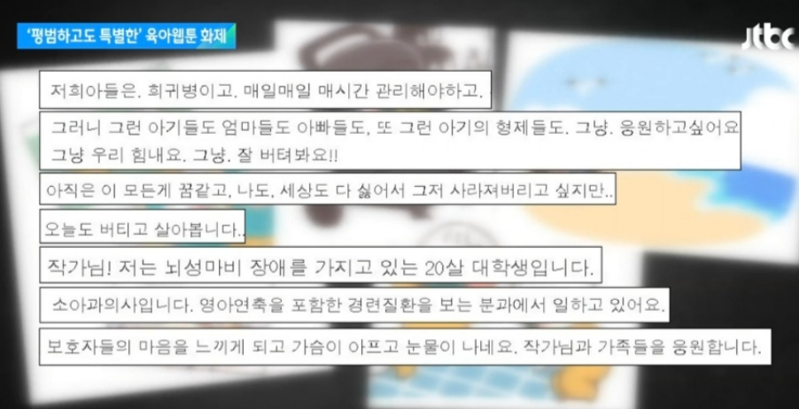 특히 유영 작가는 인터뷰에서 웹툰을 통해 자신을 비롯한 다른 장애아를 키우는 부모들이 느꼈던 외로움과 고통을 공감하고 위로받기를 바랐다고 전했습니다. 그녀는 “장애아를 키우는 부모가 느끼는 외로움과 고통이 이제 막 장애자녀를 품에 안은 또 다른 부모들에게는 덜했으면 좋겠다”라는 소망을 남겼습니다.