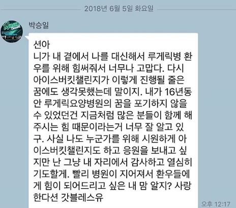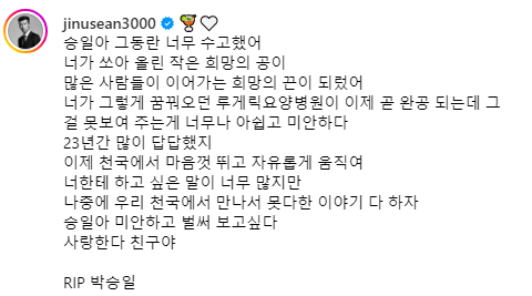 션은 인스타그램을 통해 "승일아 그동안 너무 수고했어. 네가 쏘아 올린 작은 희망의 공이 많은 사람들이 이어가는 희망의 끈이 되었어"라는 글을 올리며 박승일의 헌신과 노력을 기렸습니다. 박승일이 꿈꾸던 루게릭병 환자들을 위한 요양병원은 이제 거의 완공을 앞두고 있으며, 그가 남긴 유산은 앞으로도 많은 사람들에게 희망을 줄 것입니다.