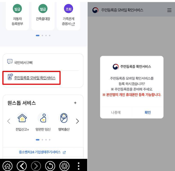 로그인이 완료되면, 정부24 앱에서 '주민등록증 모바일 확인 서비스'를 선택합니다. 이 서비스는 실물 주민등록증을 대체할 수 있는 모바일 신분증을 발급하는 과정으로, 본인의 휴대폰과 실물 주민등록증이 있어야 절차를 진행할 수 있습니다.