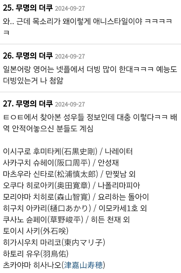 '흑백요리사'의 우승자를 향한 관심도 엄청난데요, 해외 시청자들 사이에서는 성우로 인해 우승자가 이미 스포되었다는 이야기가 나오고 있습니다. 넷플릭스는 영어, 일본어, 스페인어 등 다양한 언어로 더빙을 제공하고 있는데, 이 과정에서 유명 성우가 맡은 출연자가 우승자가 아닐까 하는 추측이 돌고 있습니다. 성우의 인지도를 기반으로 한 이러한 예측은 일부 시청자들에게 설득력 있게 다가오고 있으며, 일본에서 특히 이러한 추측이 활발하게 제기되고 있습니다.