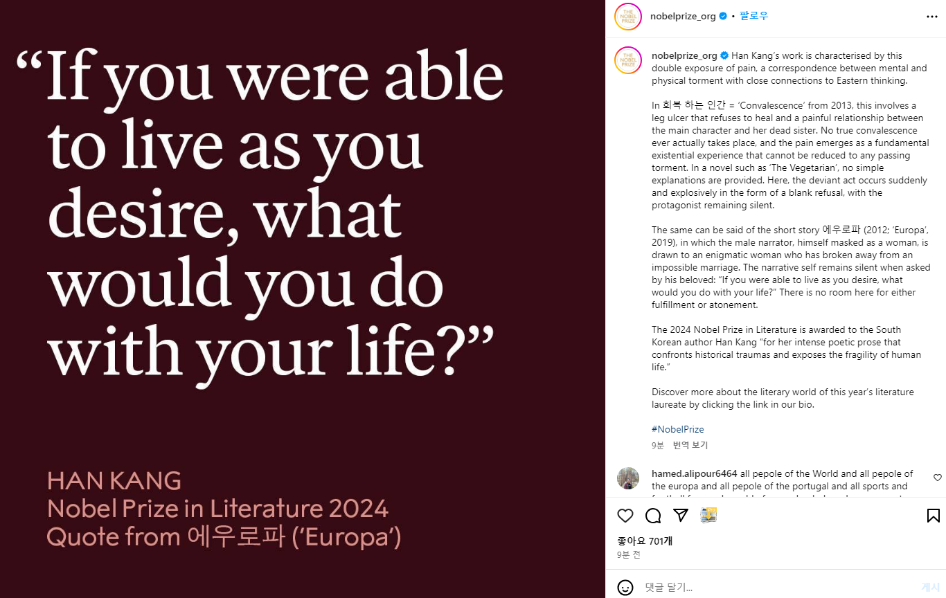 한강이 이번에 노벨 문학상을 수상한 것은 단순히 개인적인 성과에 그치지 않습니다. 이는 한국 문학이 세계 문학계에서 인정받는 순간이며, 더 나아가 한국의 문화적 자산이 세계로 뻗어 나가는 데 중요한 이정표가 될 것입니다. 한강의 작품은 단순히 한국 사회의 문제를 다루는 것에 그치지 않고, 인간 본연의 문제를 깊이 있게 탐구함으로써 전 세계 독자들에게 보편적인 메시지를 전달하고 있습니다.