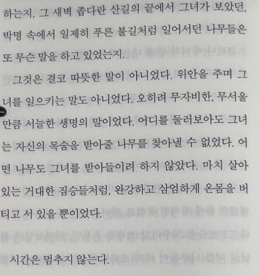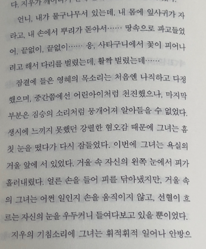 영혜는 정신병원에서도 음식을 거부하고, 자신이 나무가 되려 한다는 환상에 사로잡히게 됩니다. 그녀는 점점 더 현실과 단절된 삶을 살아가며, 자신의 내면의 폭력과 억압에서 벗어나기 위해 몸부림치지만, 끝내 성공하지 못합니다. 이 마지막 장면은 영혜가 사회적 틀에서 벗어나려는 시도가 결국 실패로 끝나는 상징적인 장면으로, 한강은 이를 통해 인간이 가지는 본질적 고독과 한계를 드러냅니다.