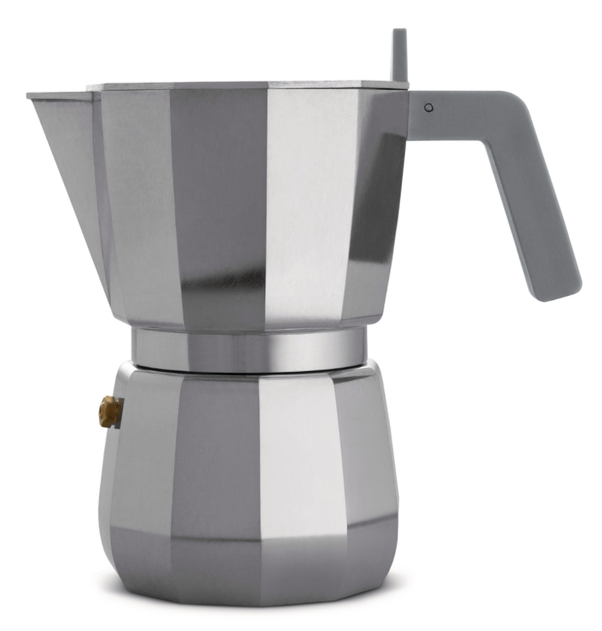 원본과 마찬가지로이 에스프레소 메이커는 다이 캐스트 알루미늄으로 만들어졌으며 독특한면이있는 바디가 특징입니다. 그러나 그것은 평평한 뚜껑과 소란스럽지 않은 손잡이가있는 단순한 프로파일을 가지고 있습니다.