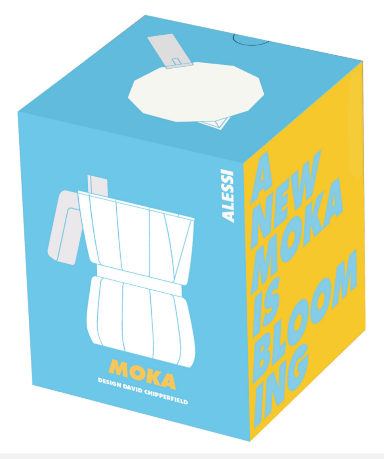 Chipperfield의 Moka는 높이가 11 ~ 18cm 인 세 가지 크기로 제공됩니다. 제품의 시각적 정체성의 일부를 구성하는 굵은 노란색과 파란색 그래픽이있는 상자에 들어 있습니다.