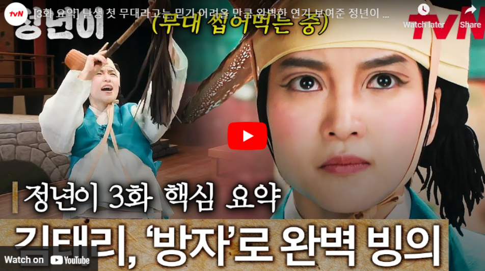 길거리에서 탈춤을 추는 광대를 따라다니며 캐릭터 연구에 몰두한 정년이는, 자신만의 스타일로 방자 역할을 소화해내며 단장에게 인정받습니다.