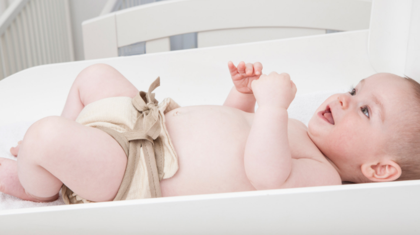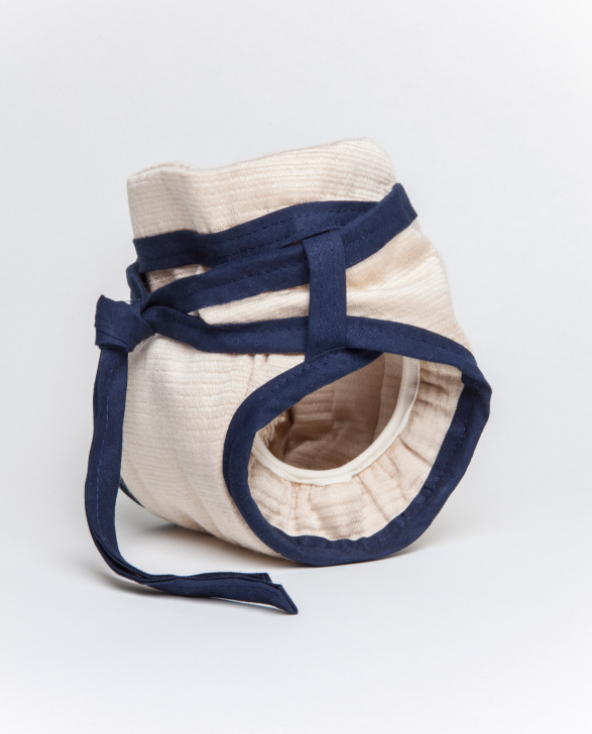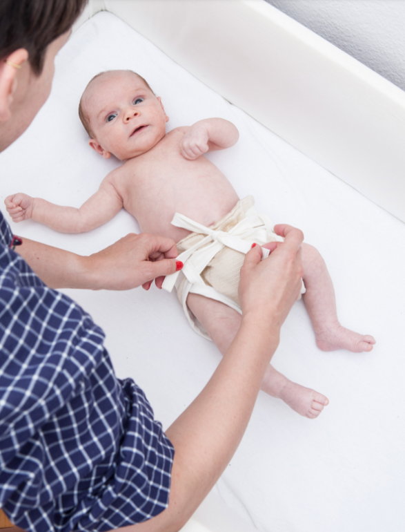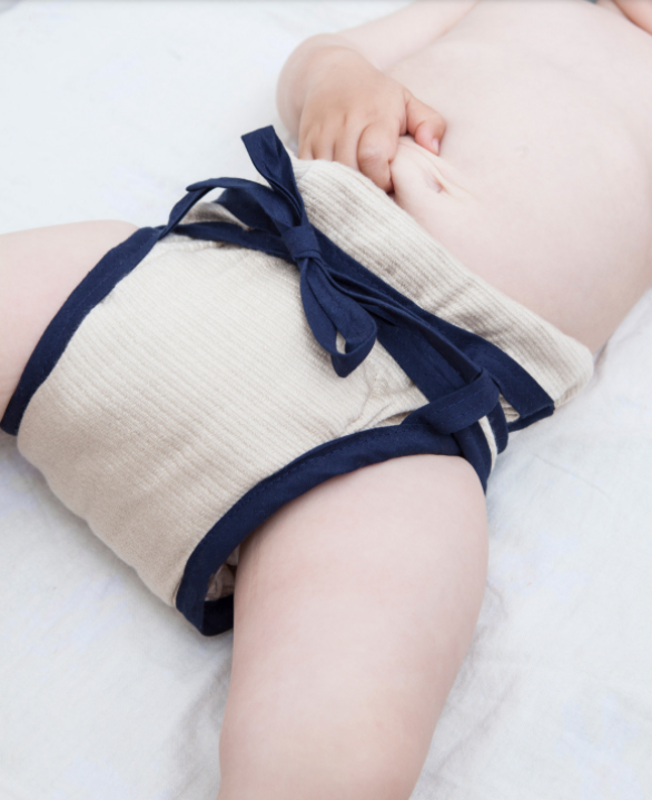 기저귀는 콘트라스트 리브가있는 자연스러운 색상이며 앞면에서 간단하게 연결됩니다.