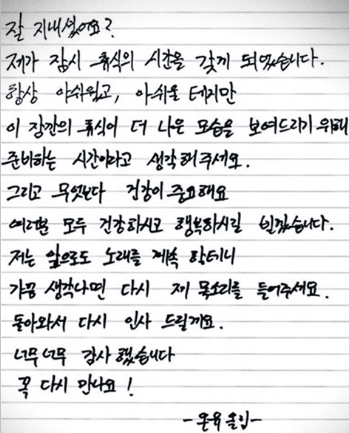 당시 소속사였던 SM엔터테인먼트는 "온유의 건강 회복을 위해 일정 기간 활동을 쉬게 되었다"고 발표하며 팬들에게 양해를 구했죠.