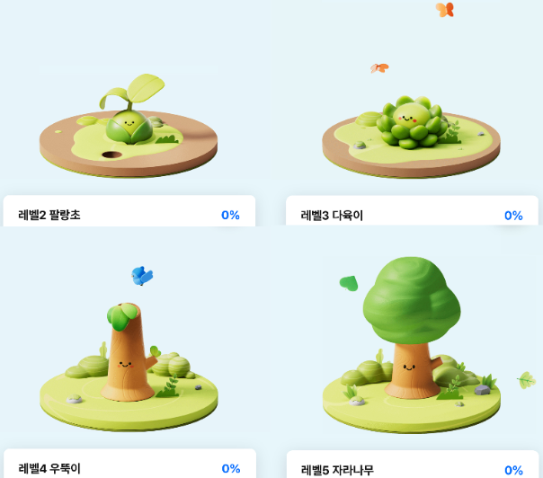 레벨 1인 ‘빼꼬미’ 단계에서 시작해 물주기와 영양제 주기로 경험치를 쌓아 나무를 키우는 방식이었고, 하루 한 번의 물주기로 1원을 적립할 수 있었습니다.