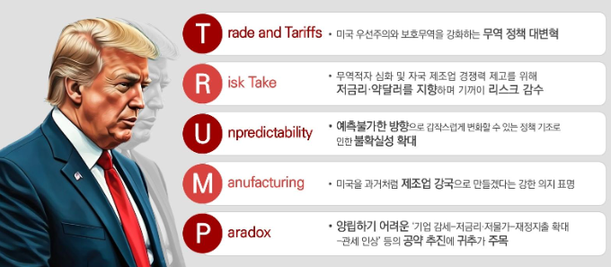 트럼프 대통령의 정책은 크게 방위산업 강화, 에너지 산업 지원, 인프라 확장, 그리고 무역 보호주의로 요약될 수 있습니다.