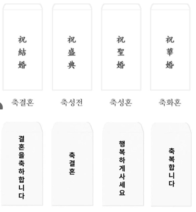 - 祝華婚(축화혼): 아름다운 결혼을 축하한다는 의미로, 주로 신부 측에 사용.
