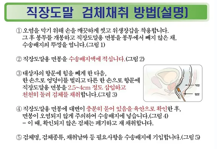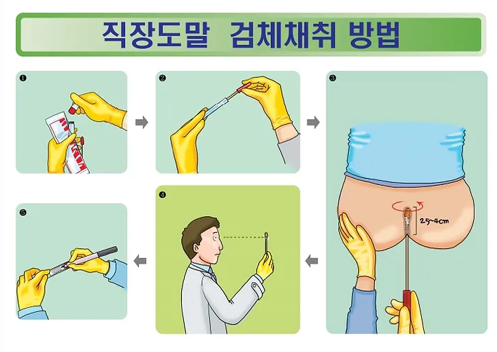 - 검체 채취: 면봉을 항문에 약 2.5cm 삽입 후 5~10회 회전시켜 검체를 채취