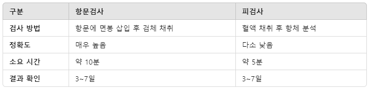 항문검사는 감염 여부를 직접적으로 확인할 수 있는 높은 정확도의 검사이고, 피검사는 항체 유무를 통해 간접적으로 확인합니다.