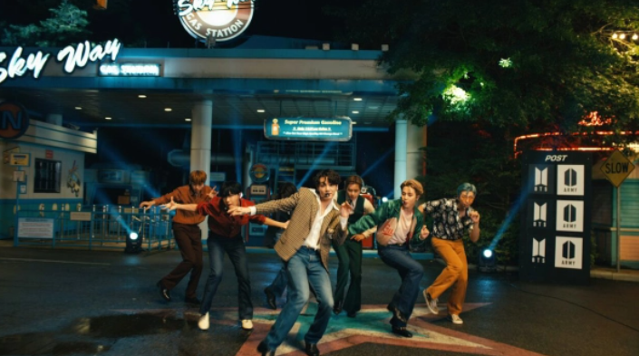 정국, RM, V, 지민, 제이홉, 슈가, 진으로 구성된 이 밴드 멤버들은 주유소, 영화관, 레스토랑을 배경으로 춤을 추면서 꼼꼼하게 점수를 매만지며 70년대 초반의 풋풋한 모습을 보였습니다. 그 표지판들 중에는 ARMY에 대한 외침, 그 밴드의 헌신적인 팬들로 이루어진 팬덤이 있습니다.