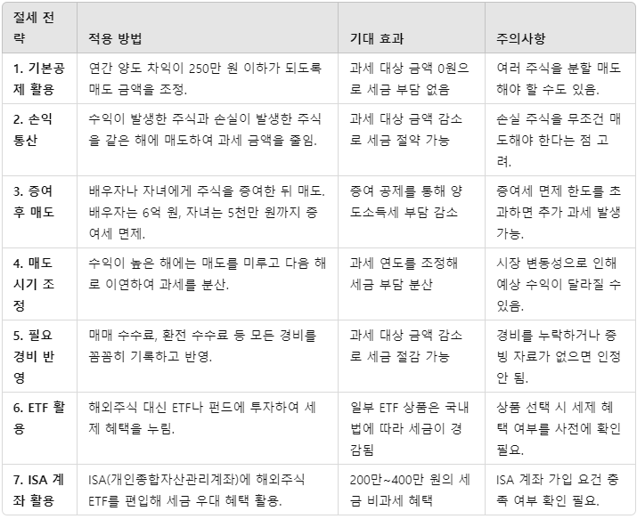 연간 양도 차익이 250만 원 이하로 조정되도록 매도하면 세금을 전혀 내지 않아도 됩니다. 이를 위해 분할 매도 전략을 활용하세요.