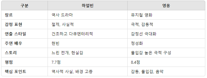 하얼빈은 역사적 사실에 충실한 리얼리즘 영화이고, 영웅은 감동적인 서사와 음악을 결합한 뮤지컬 영화입니다.
