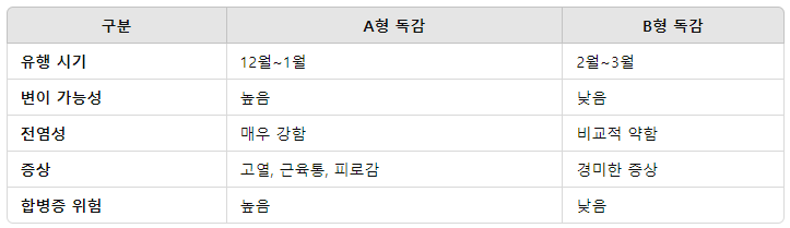 반면 B형 독감은 2월~3월에 주로 유행하며, 변이가 적고 증상이 비교적 가벼운 편입니다.