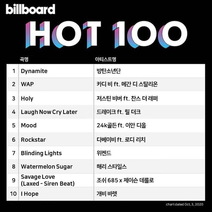 | BTS 다이너마이트, 9월 첫주 빌보드 차트 HOT100 1위 (0) | 2020.09.03 |