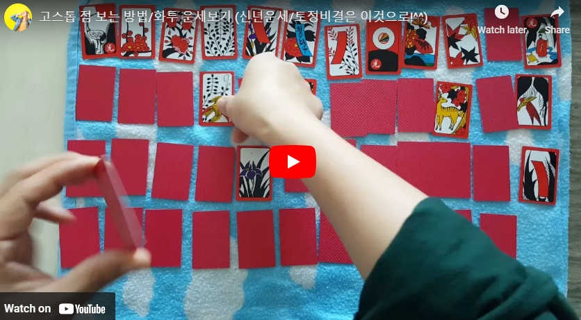 섞은 화 투 중에서 3장 또는 5장을 뽑습니다. 각 패의 조합에 따라 운이 달라지므로, 어떤 카드가 나오는지 집중해 보세요.