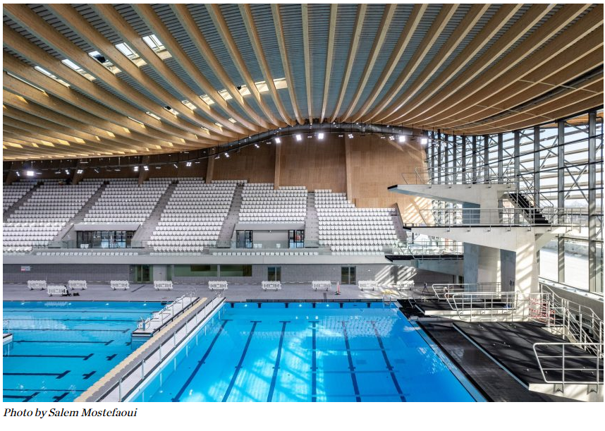 - 네덜란드 스튜디오 VenhoevenCS와 프랑스 건축사무소 Ateliers 2/3/4가 공동 설계한 아쿠아틱 센터는 목재로 주로 구성된 새로운 수영장 복합 단지입니다. 80미터 길이의 곡선형 지붕이 인상적인 이 건물은 주로 태양광 패널로 덮여 있어 프랑스 최대의 도시 태양광 농장 중 하나로 자리잡고 있습니다. 아티스틱 수영, 다이빙, 수구 경기가 열리는 이 아쿠아틱 센터는 올림픽 이후에도 다목적 스포츠 시설로 활용될 예정입니다. 이 시설은 지속 가능한 건축의 좋은 예시로, 올림픽 이후에도 지역 사회에 큰 기여를 할 것입니다.