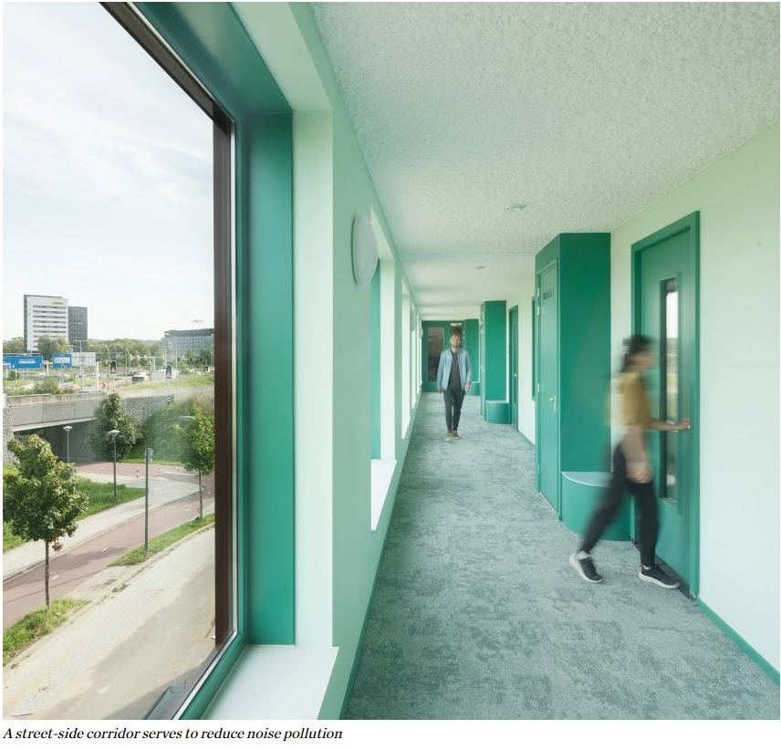 고속도로를 마주보는 쪽에서 Martens Willems & Humblé Architecten는 소음 감소와 듀얼 아스펙트 공간에 대한 요구 사이에서 균형을 맞추어야 했습니다. 이는 큰 창문 두 겹을 만들어 순환 복도 또는 "갤러리"를 통해 시야를 확보하게 했습니다.