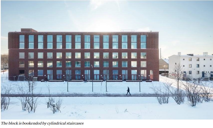 이 아파트 블록은 원통형 계단 두 개로 끝이 나며, 동쪽으로는 작은 돌출된 볼륨으로 낮은 주택 블록의 규모와 맞닿아 있습니다.