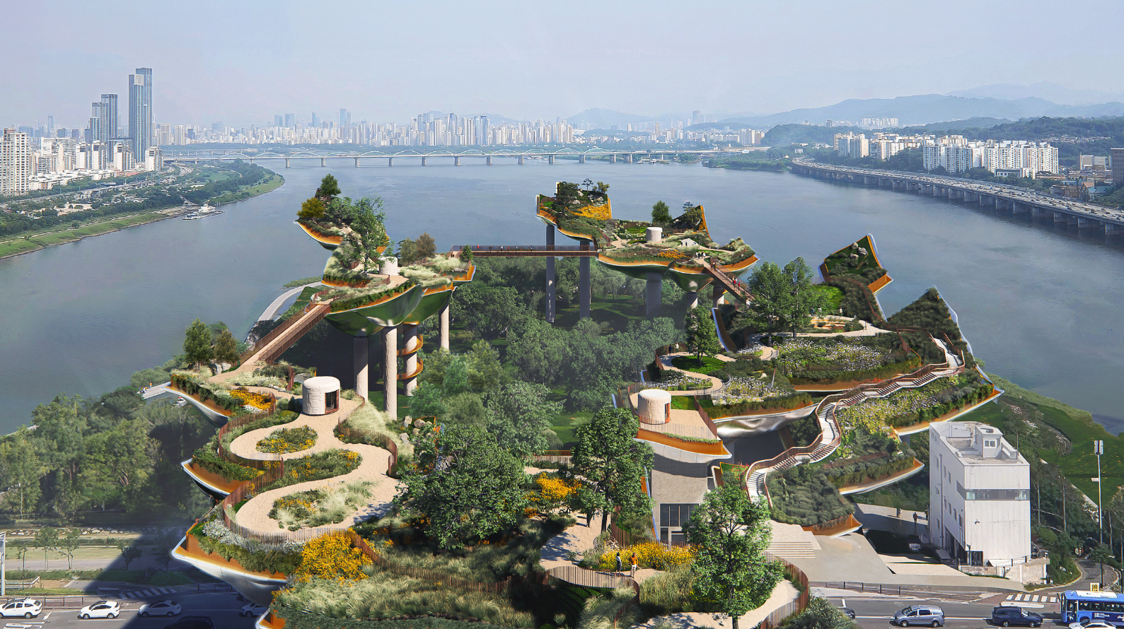 헤더윅 스튜디오는 이 스카이워크를 "작은 떠다니는 섬들"로 구성하여, 공중에 떠 있는 듯한 느낌을 줄 계획입니다. 이 구조물들은 큰 기둥에 의해 지지되며, 반사되는 금속 외장으로 감싸여 있어, 공원에서 서울과 한강을 바라보는 멋진 전망을 제공합니다. 또한, 나선형 계단이 구조물의 기둥을 감싸고 있어, 지상층과 플랫폼 간의 직접적인 접근이 가능하도록 설계되었습니다. 이 구조물의 가장 높은 지점에서는 이벤트를 위한 무대가 설치될 예정입니다.